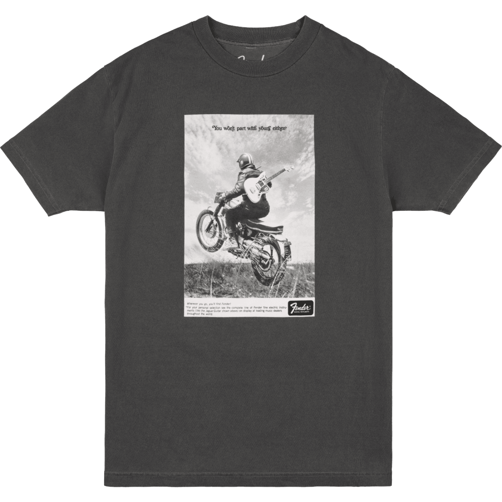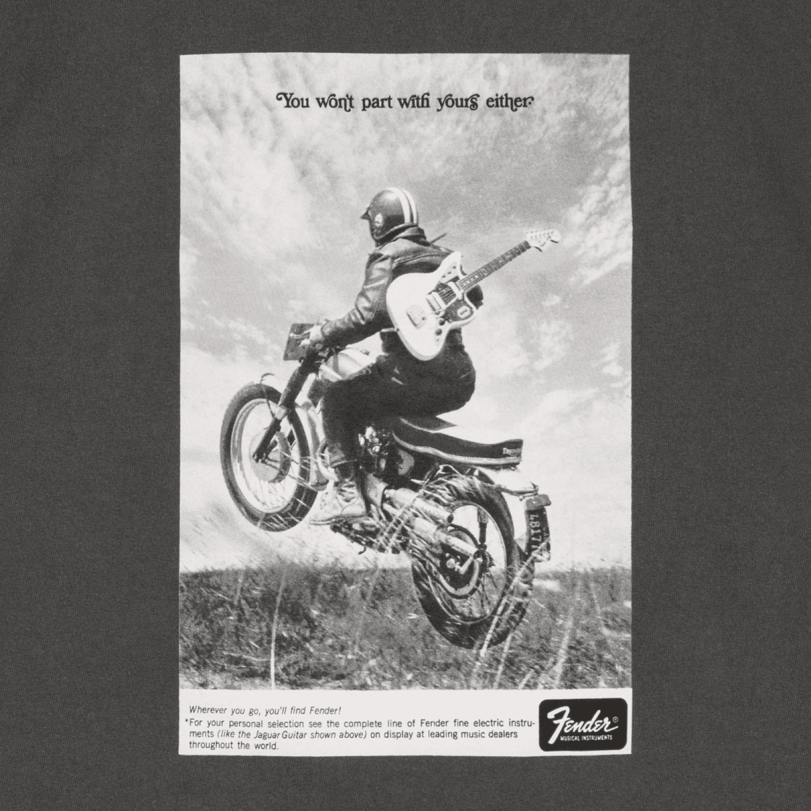 Lanciata nel 1960, la campagna Fender "You won't part with yours either" era rivolta ai chitarristi che amano le loro chitarre Fender e il profondo legame emotivo che i musicisti spesso sviluppano con i loro strumenti. Diventa parte della nostra storia indossando la tua maglietta nera vintage con la grafica di un motociclista da questa iconica pubblicità vintage. Ora sei pronto per Hit the Open Road!!