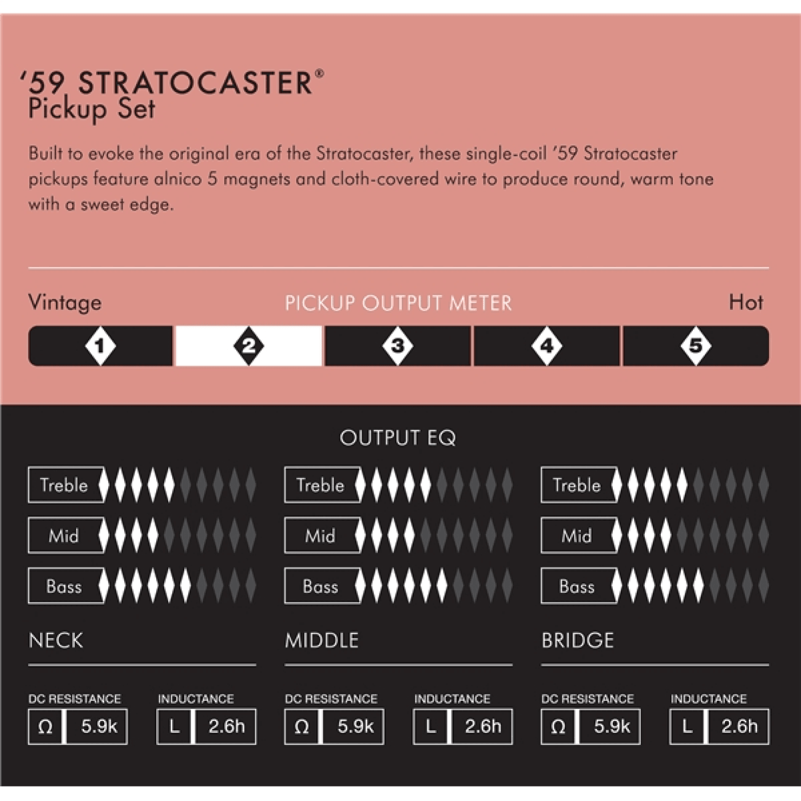 Costruiti per rievocare l'era originale della Fender Stratocaster, questi pickup Stratocaster del '59 single-coil producono un suono caldo e rotondo con un tocco dolce. Comprimere il testo