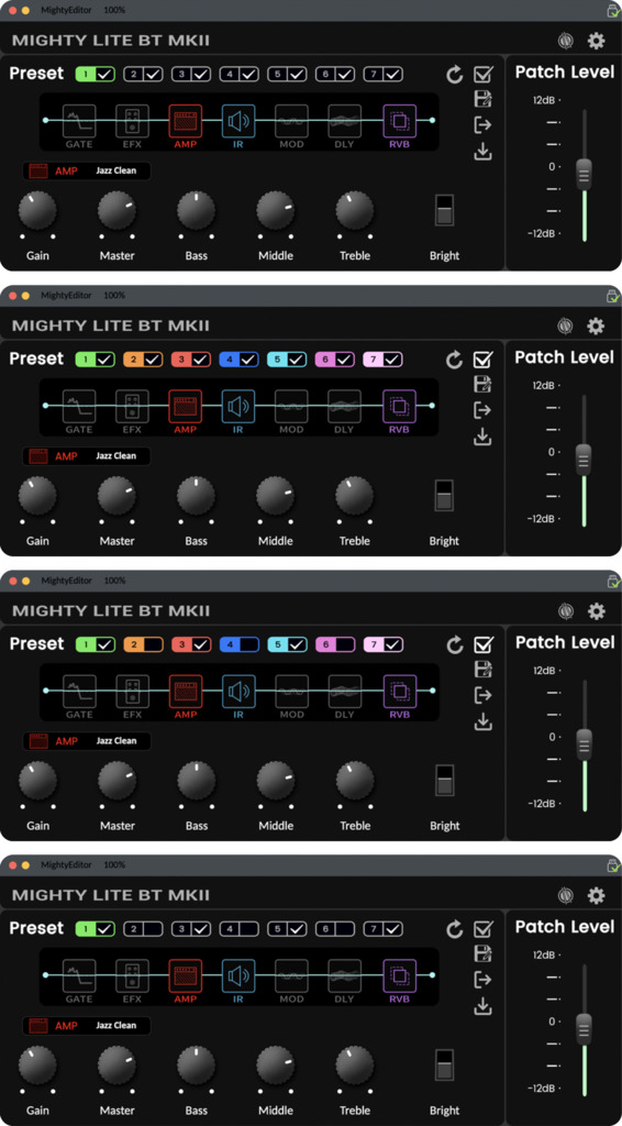 L'APP MightyAmp™ e il software di editing Mighty Editor™ consentono di modificare tutti i blocchi di segnale e i parametri di GATE, EFX, AMP, IR, MOD, DLY e RVB. Oltre ai 34 IR integrati, sono presenti 20 slot vuoti per il caricamento di IR di terze parti. Non è necessario preoccuparsi della frequenza di campionamento: il software di editing Mighty Editor™ è in grado di convertire automaticamente il formato WAV (IR).