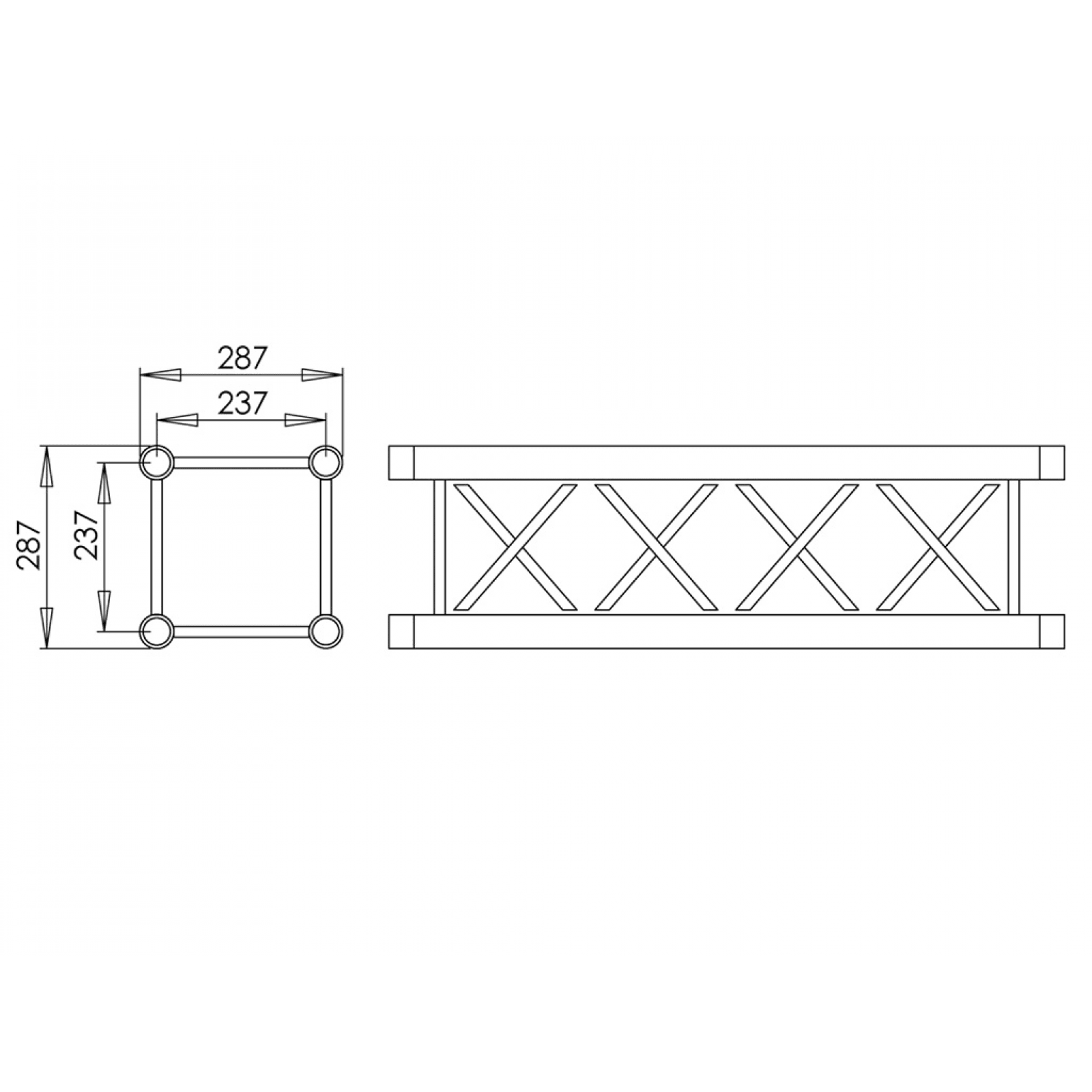 Traliccio in alluminio di sezione quadrata di 29 cm, composta da un tubo principale di 50 mm di diametro e 2 mm di spessore e da un tubo ausiliario di 16 mm di diametro e 2 mm di spessore. È disponibile nelle lunghezza di 3 m e nel colore nero. Include 4 coni doppi, 4 perni, 4 perni filettati e 4 clip di sicurezza 'R'. SERIE P