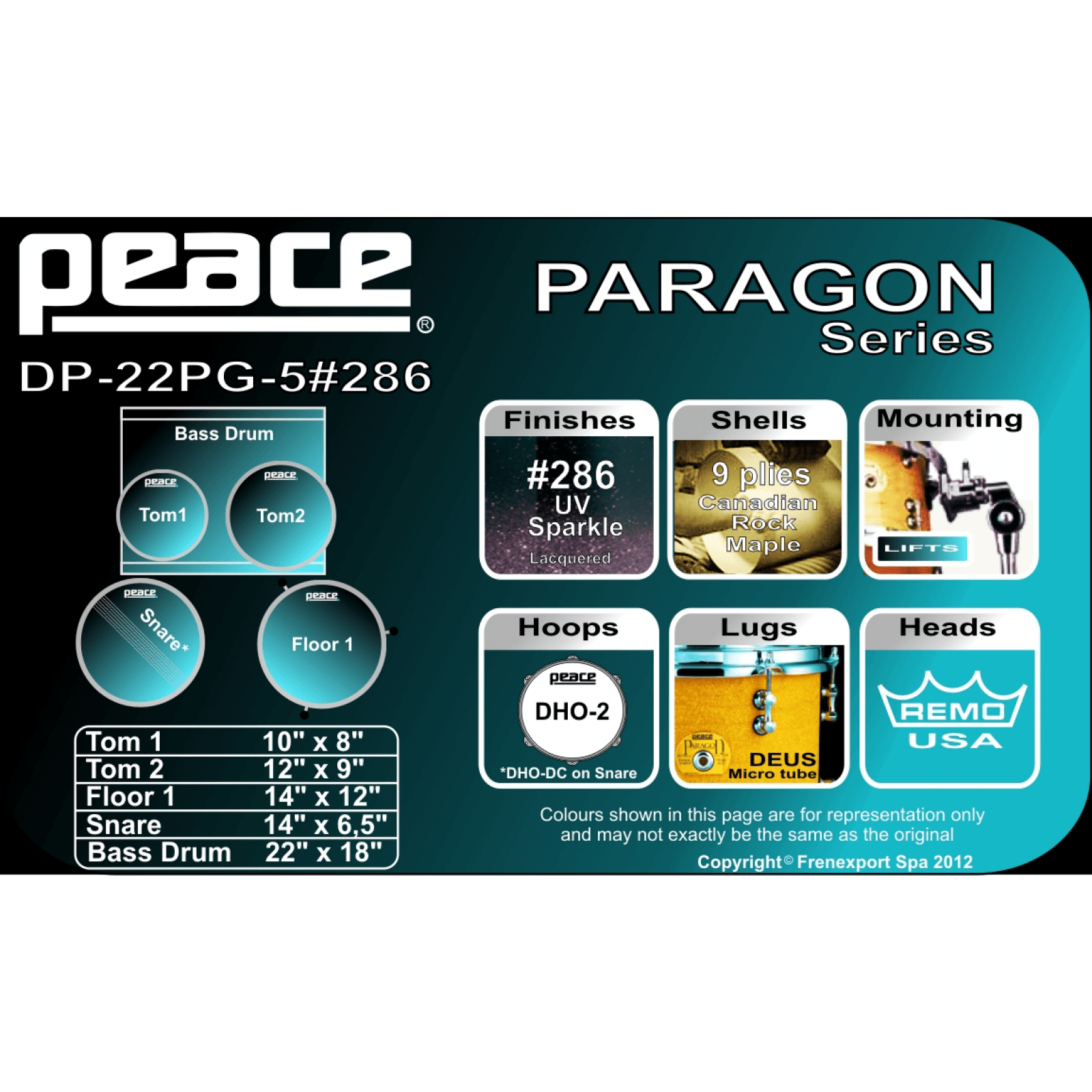I veri appassionati di batteria scelgono da sempre fusti in Acero. E' per questo che il team Peace ha sviluppato la serie PARAGON, creando fusti in Acero Canadese da 9 strati. Semplicemente "il meglio del meglio". L'ampia gamma di misure e livree disponibili danno al musicista, sia esso professionista o amatore, la possibilità di personalizzare il proprio set in base alle più disparate esigenze.L'utilizzo dei sistemi brevettati LIFTS™ per il supporto dei toms e delle meccaniche DEUS Microtube™ favoriscono una migliore e facile accordatura nonchè la possibilità di cambiare le pelli con il fusto montato all’asta.Il look accattivante, il suono superlativo ed una costruzione visibilmente tecnologica rendono la PARAGON una serie che non lascia spazio a compromessi.I pacchetti standard prevedono la fornitura dei soli fusti insieme ai quali è possibile ordinare separatamente tutti gli accessori del vasto catalogo Peace. Comprimere il testo
