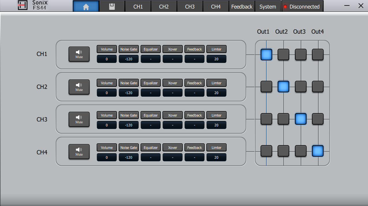 Comprimere il testoSoniX FS44 è basato su un processore SHARC di quarta generazione da 450 MHz/32 bit. La conversione AD/DA è a 24 bit con frequenza di campionamento di 96 kHz. Ogni canale è dotato di Phantom a 48V, Noise Gate, equalizzatore grafico a 6 bande, filtro passa-alto e filtro passa-basso, correzione automatica dello spostamento di fase/frequenza e limitatore.