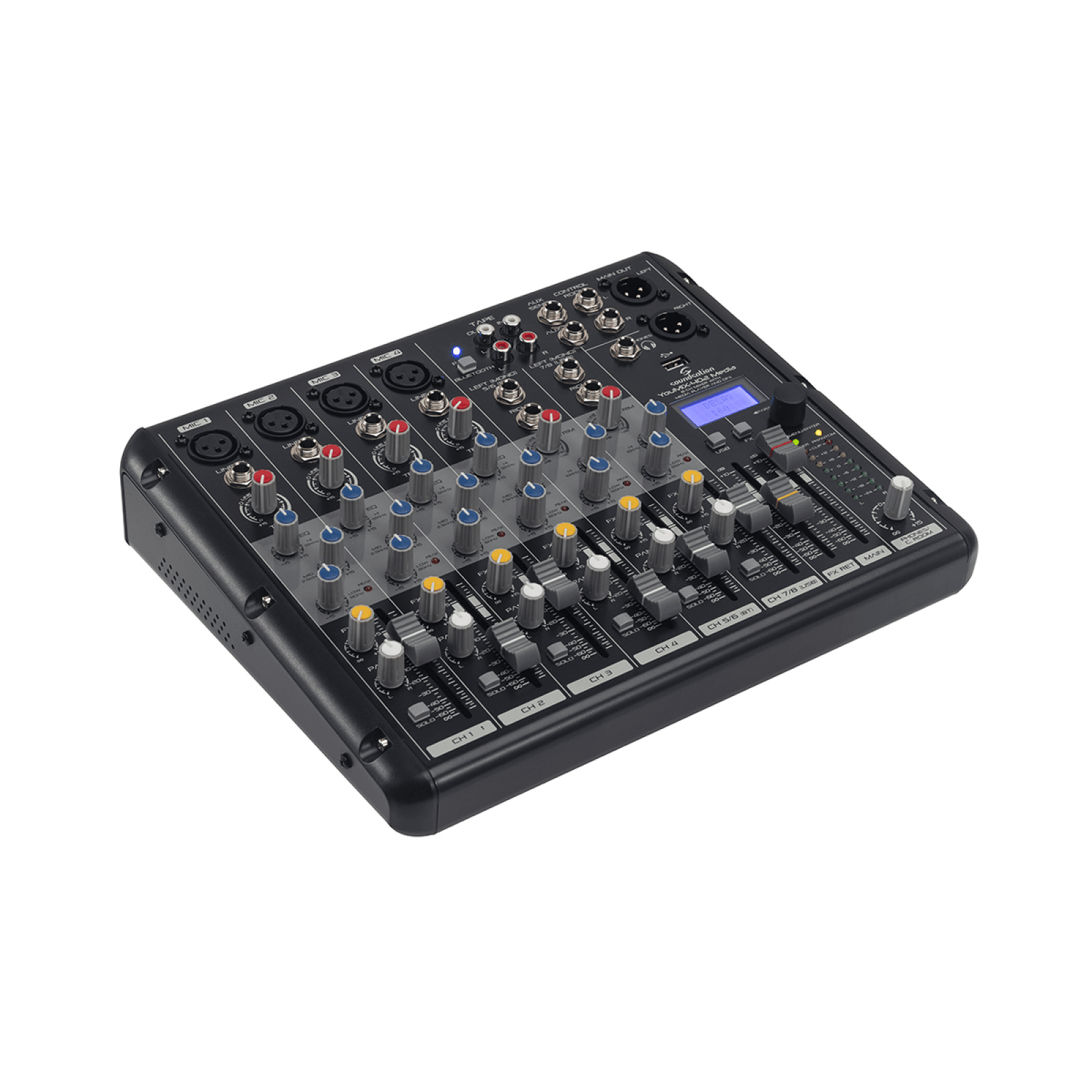 Slider di Livello Ritorno FX da 60mm, Slider di Livello Main da 60mm, Volume Cuffie/Control Room, Indicatore Led di Accensione, Indicatore Led di Alimentazione Phantom, Barra VU Meter con 2x8 Led (Main Level/Solo), Display LCD 2x8 Caratteri (lettore MP3 player e multi effetto)