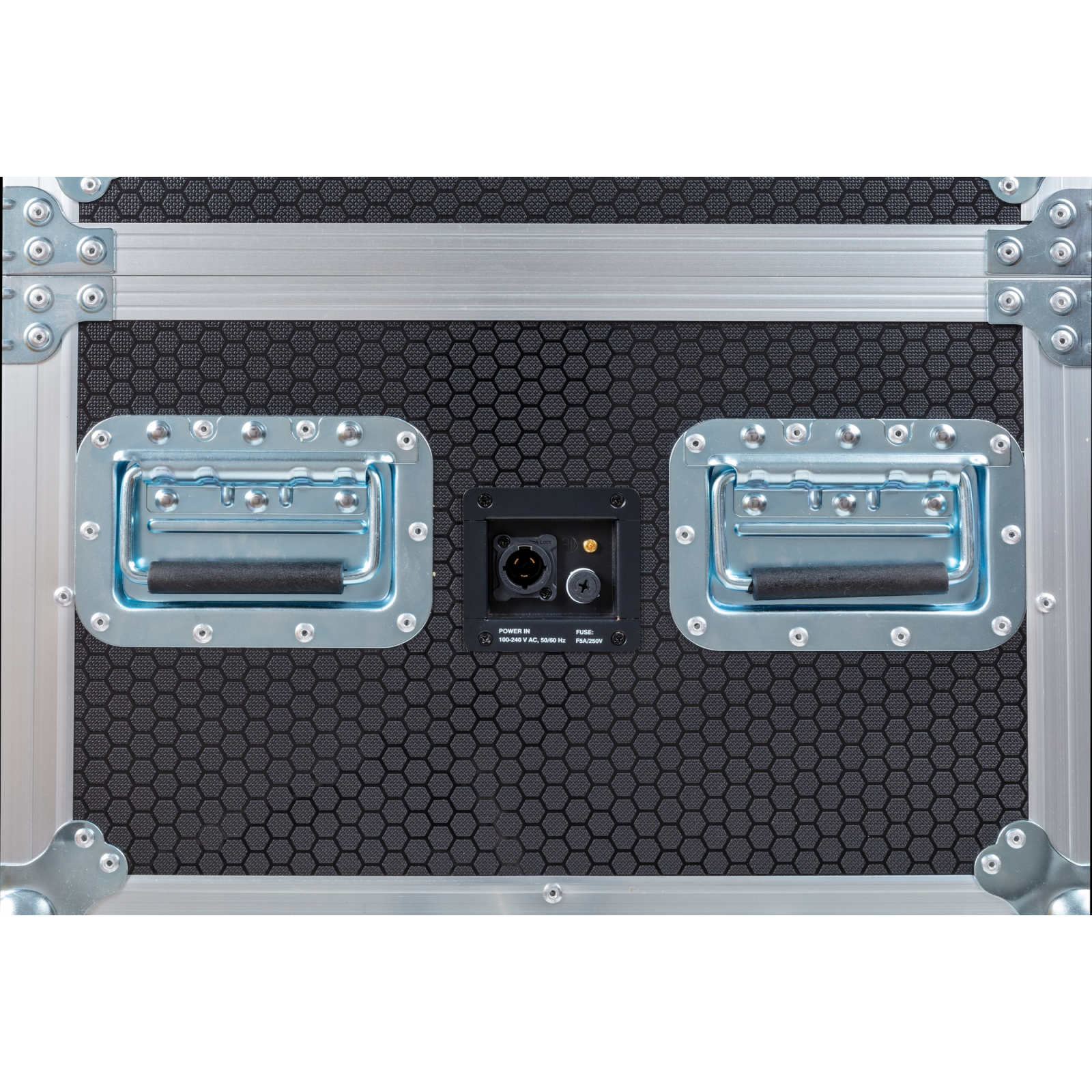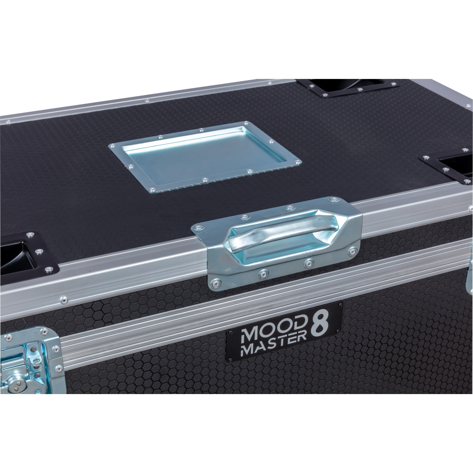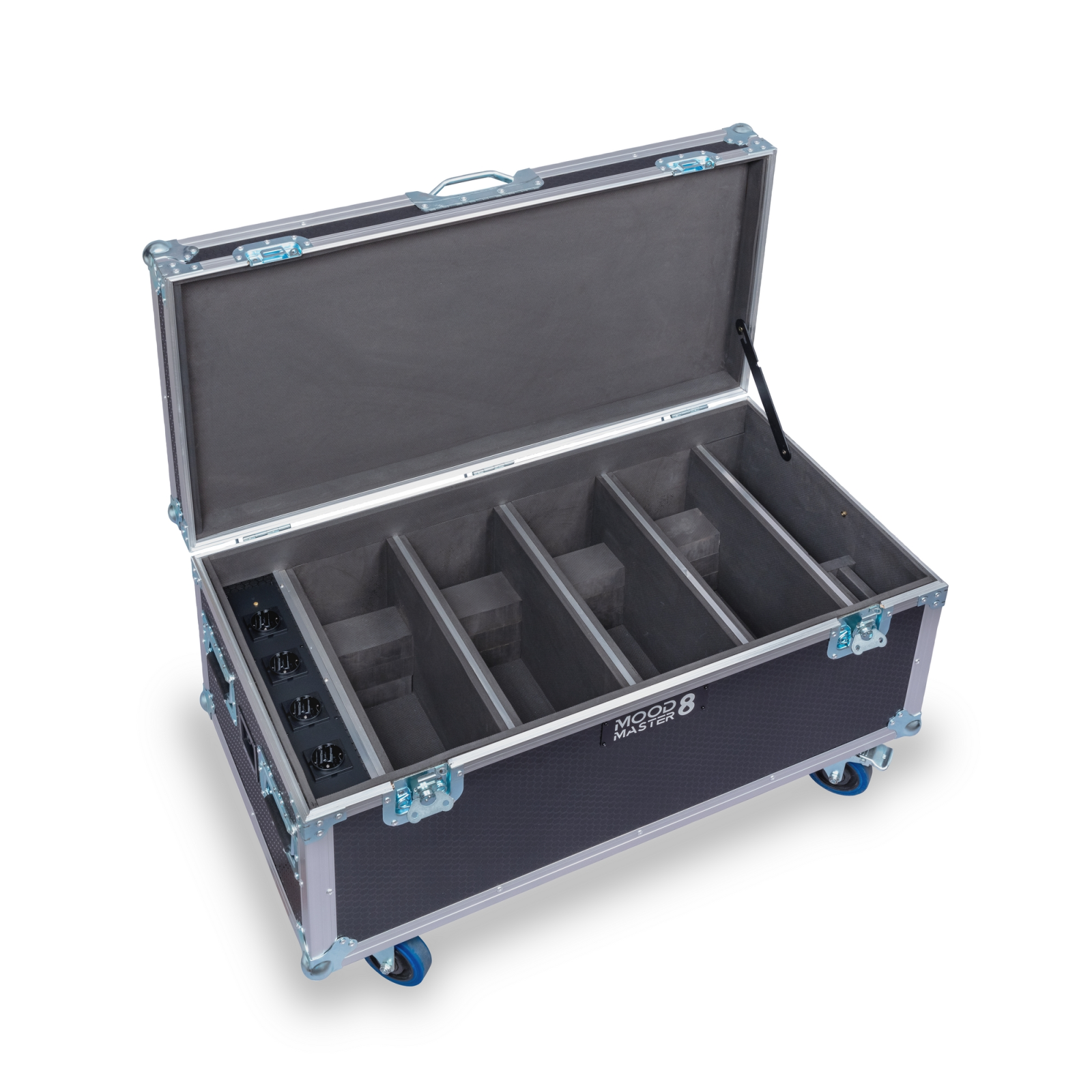 Flight case impilabile con ruote progettato per 4 unità di Mood Master 8, dotato di ingresso di alimentazione principale, connessioni di alimentazione interne multiple e scomparti dedicati per cavi e accessori.