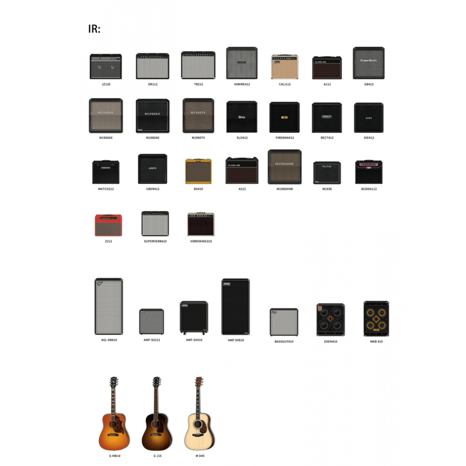 Puoi usare una vasta selezione di IR di fabbrica per elettrica, basso e acustica. Puoi anche caricare IR di terza parti tramite software.