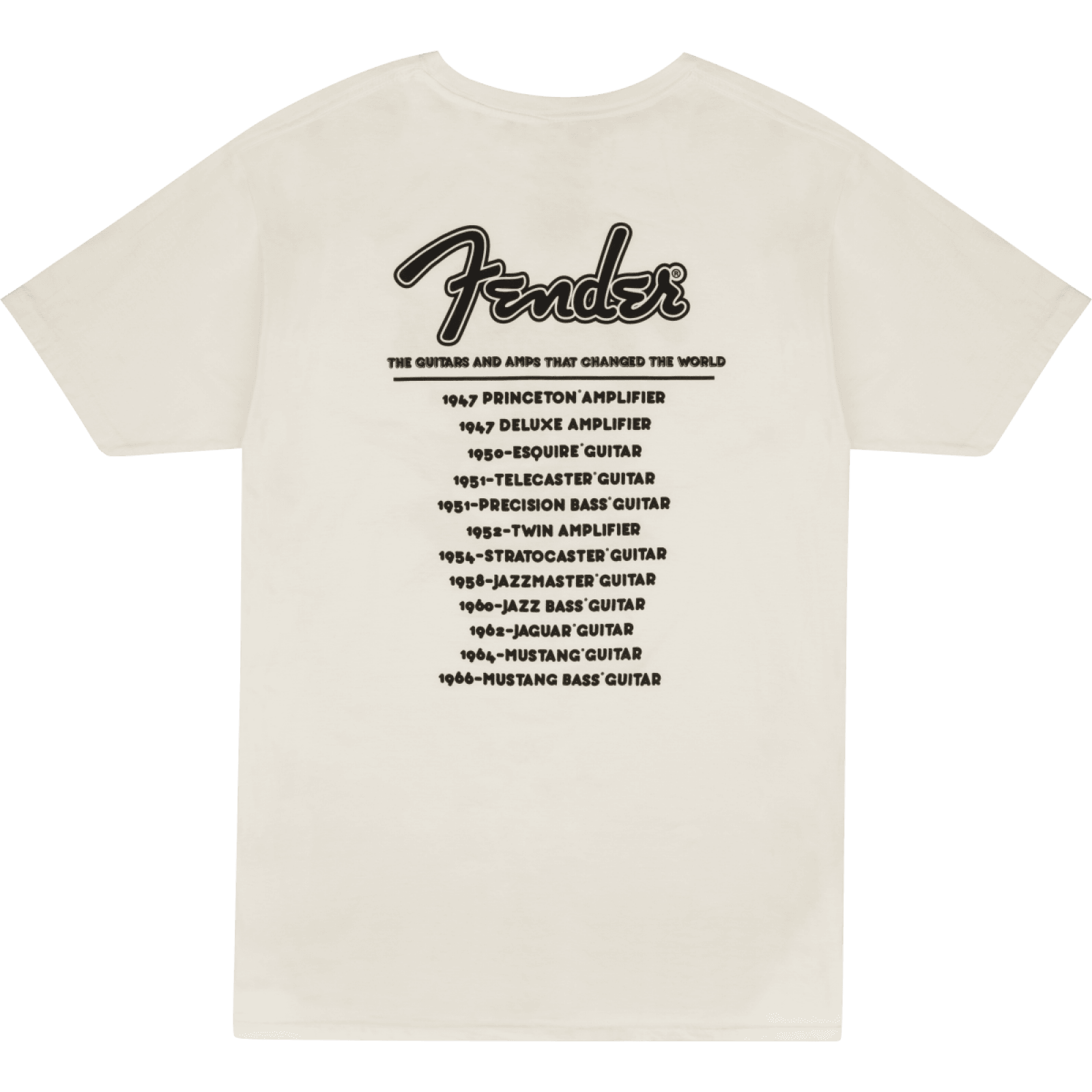 Il tour mondiale di Fender's® sta per iniziare con questa t-shirt del tour del passato. In bianco vintage, con le iconiche date di rilascio di Fender® sul retro, ti sentirai parte della nostra ricca eredità. A partire dal 1947 con la data di uscita del nostro famoso amplificatore in tweed classico Princeton® e terminando il tour nel 1966 con la data di uscita del nostro celebre basso Mustang® del 1964. Che viaggio è stato!