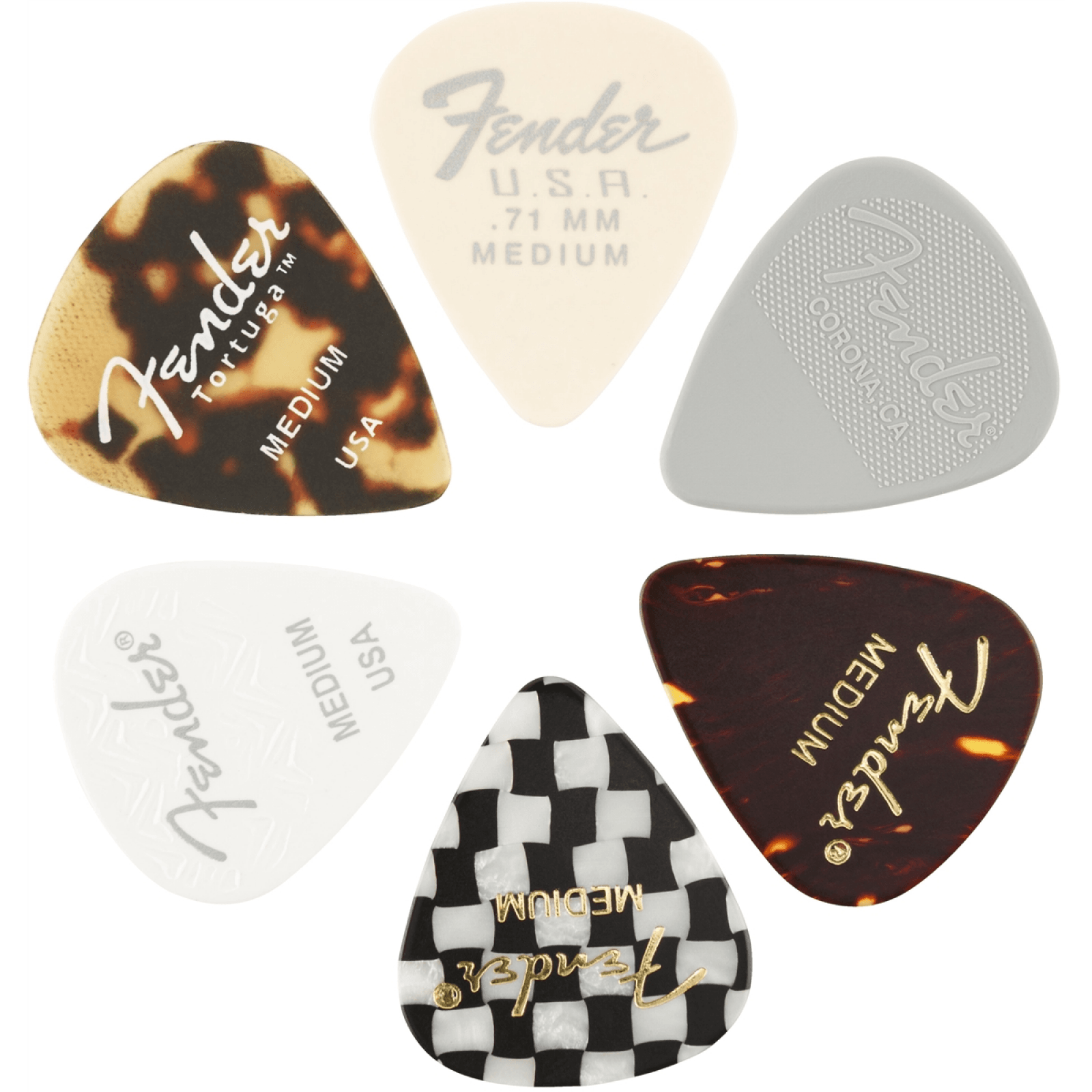 La forma tradizionale 351, la nostra più design popolare, è un accessorio perfetto per i musicisti di stili e tecniche versatili. Questa confezione da sei di plettri ne contiene uno realizzato con vari materiali Fender: celluloide, tortuga, nylon e Dura-Tone ™, insieme a un plettro Wavelength ™.