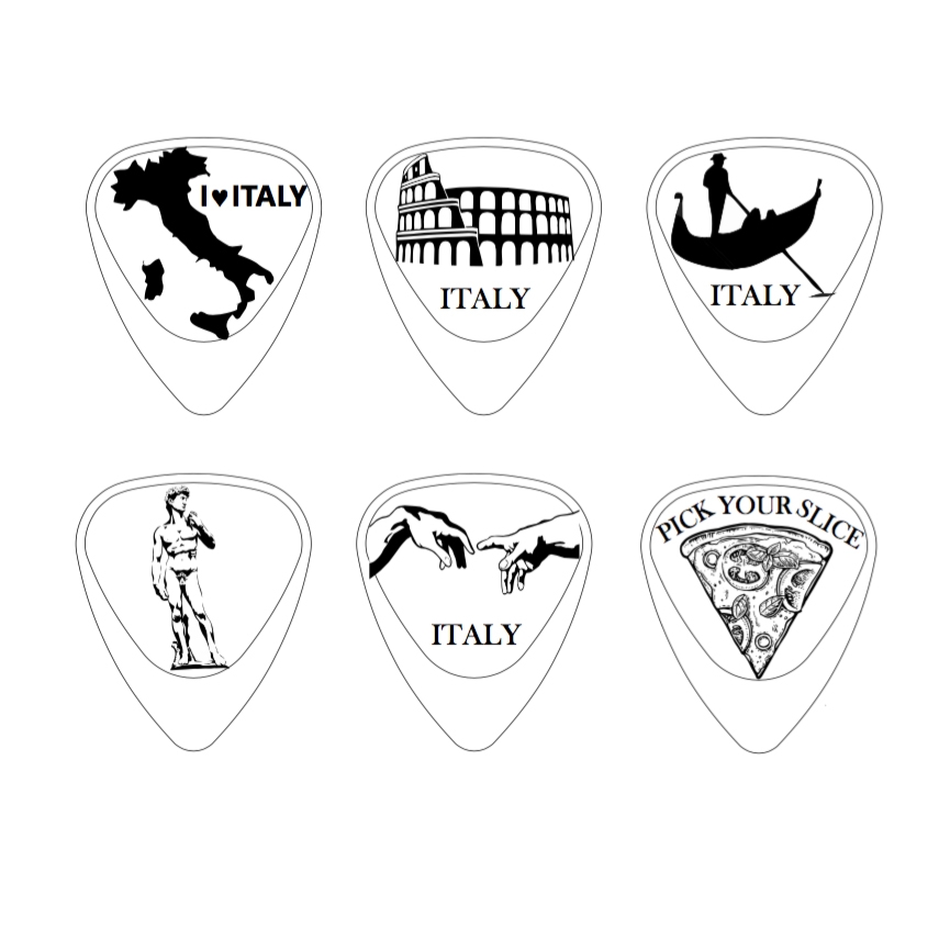 Una nuova idea targata Timber Tones: 6 grafiche diverse che rappresentano le unicità del Bel Paese finemente incise a laser su 6 selezionatissime essenze studiate per colorare il suono del musicista più smaliziato e presentate in un pregiato espositore in legno da 36 pezzi assortiti.