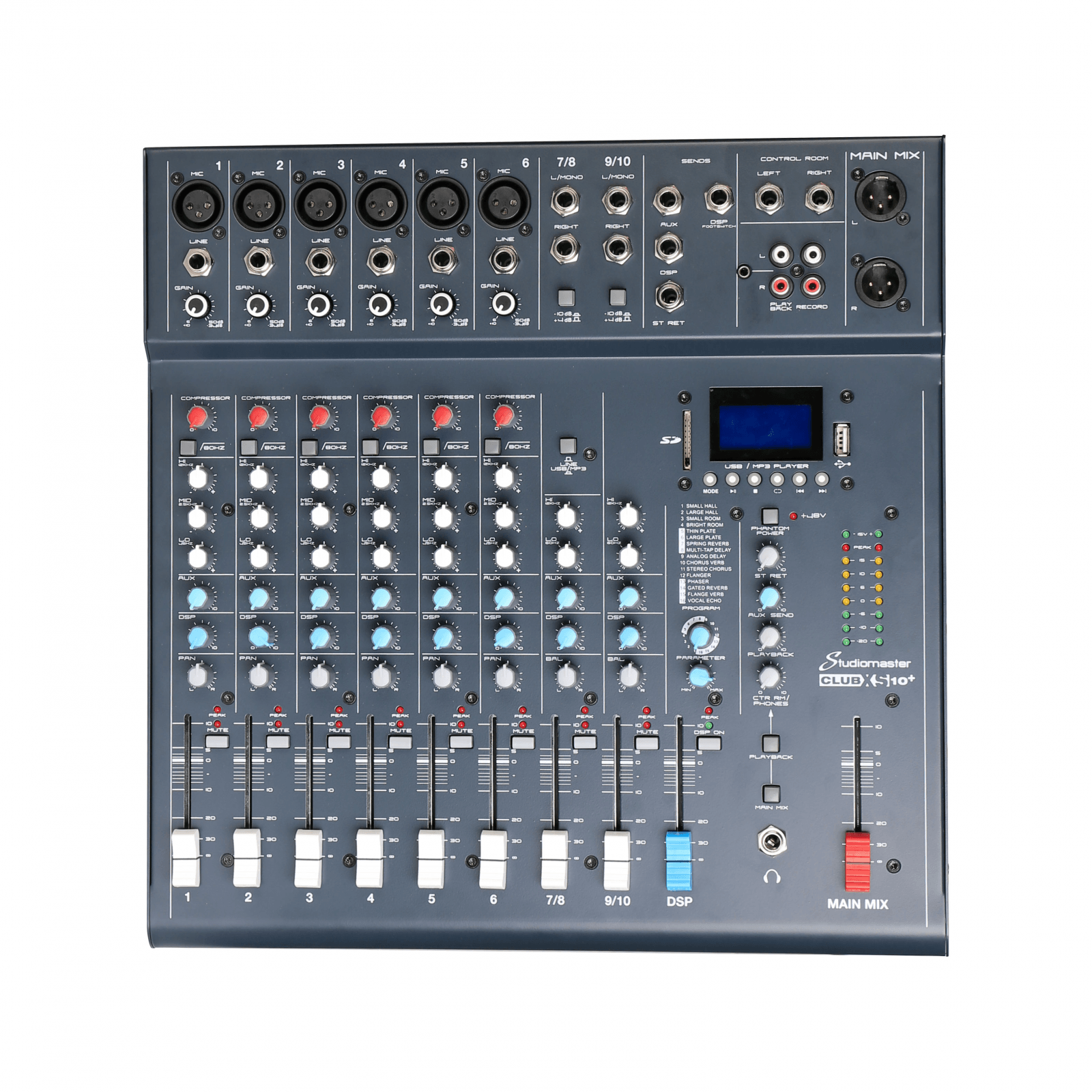 Console di missaggio compatta e portatile con 10 ingressi, connettività Bluetooth, effetti DSP integrati e funzioni di riproduzione e registrazione su scheda USB/SD. EQ a 3 bande, 2 ausiliari, connettori bilanciati microfono/linea, controllo del compressore e un utile interruttore mute su tutti i canali di ingresso microfono e linea e EQ a 2 bande con 2 ausiliari per entrambi i canali stereo. Sono inoltre presenti connettori XLR bilanciati per le uscite principali, uscite jack per gli ausiliari e la sala di controllo e connettori fono per la registrazione e la riproduzione.