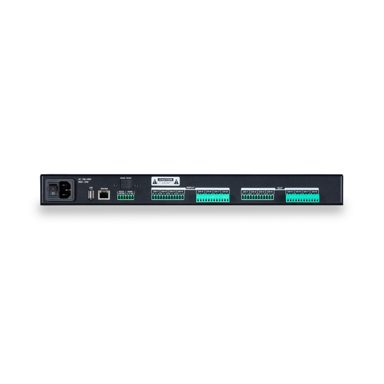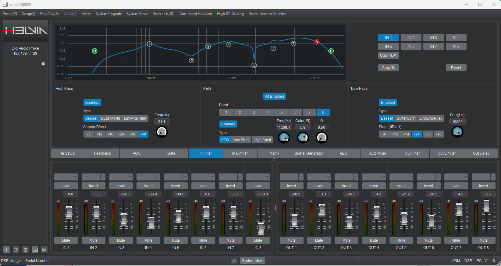 Venendo alle potenti funzioni di trattamento audio, grazie al processamento a 400MHz a virgola mobile e al controllo basato su chip dual-core a 1.2 GHz, ogni ingresso è dotato di Soppressore di Feedback Adattivo, Cancellazione Automatica dell’Eco, Controllo Automatico del Gain di Ingresso, Noise Gate, EQ parametrico a 8-bande, Filtri HPF & LPF con pendenza fino a 48dB/ottava e Limiter. Ogni uscita è dotata di EQ parametrico a 8-bande, Filtri HPF & LPF con pendenza fino a 48dB/ottava, Ritardo fino a 300ms e Limiter.