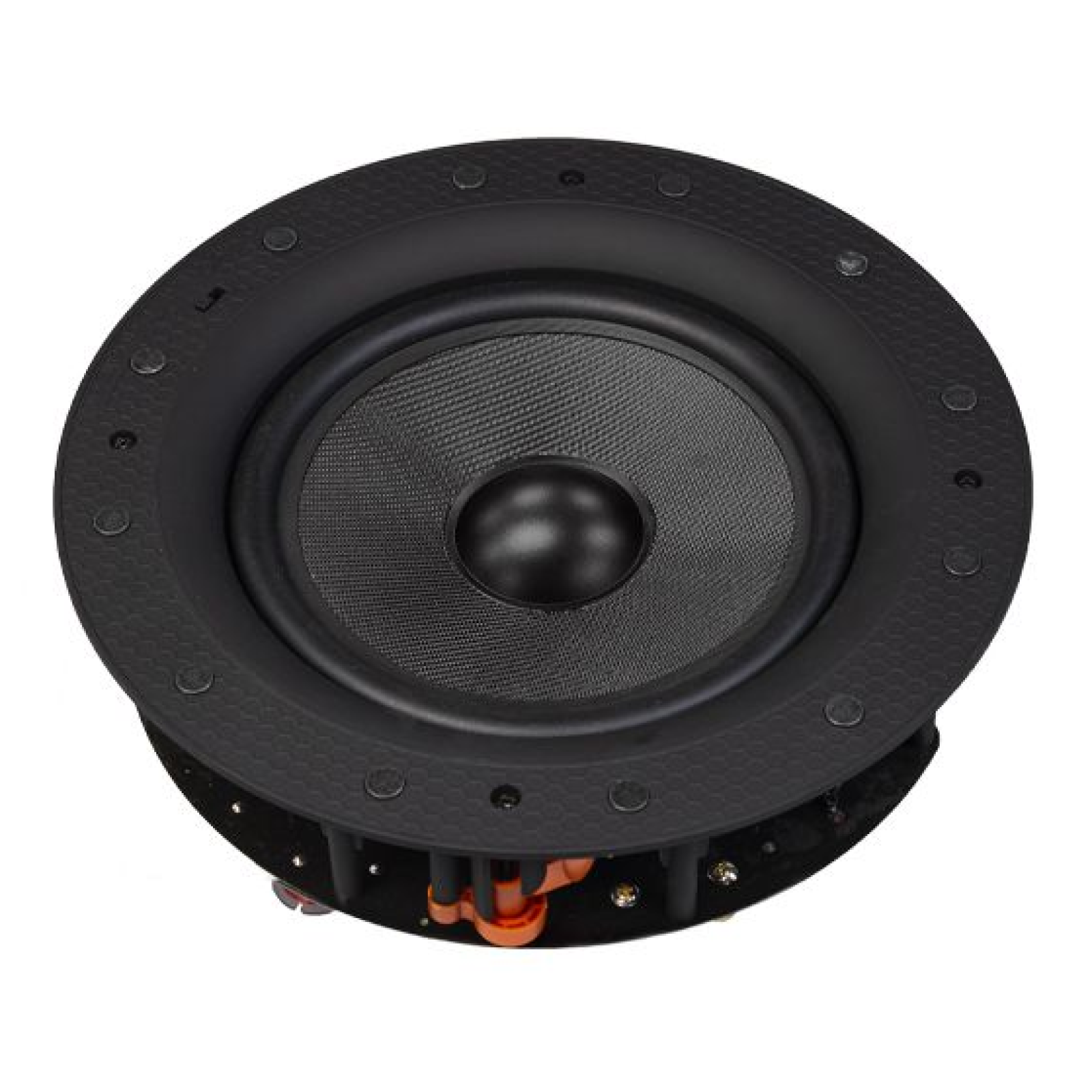 Il frontale è coperto da una griglia magnetica verniciabile, disponibile in forma rotonda (GC8S-RD) o quadrata (GC8S-SQ), bianca o nera, per integrarsi con discrezione in qualsiasi contesto.