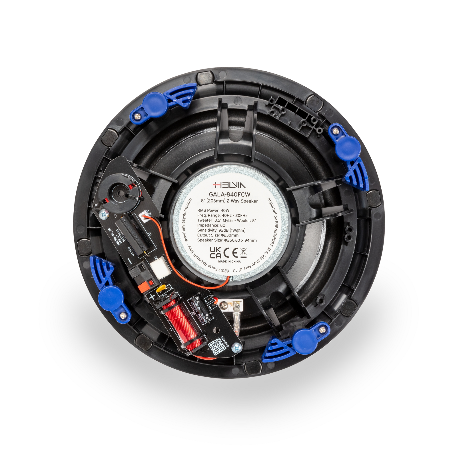 Il struttura degli altoparlanti GALA FCW è realizzata in ABS di alta qualità. Sono inoltre dotati di tweeter a cupola in Mylar da 0,5", woofer rinforzati in polipropilene e griglia metallica senza cornice con magneti, che conferiscono a questi altoparlanti un aspetto elegante e raffinato.