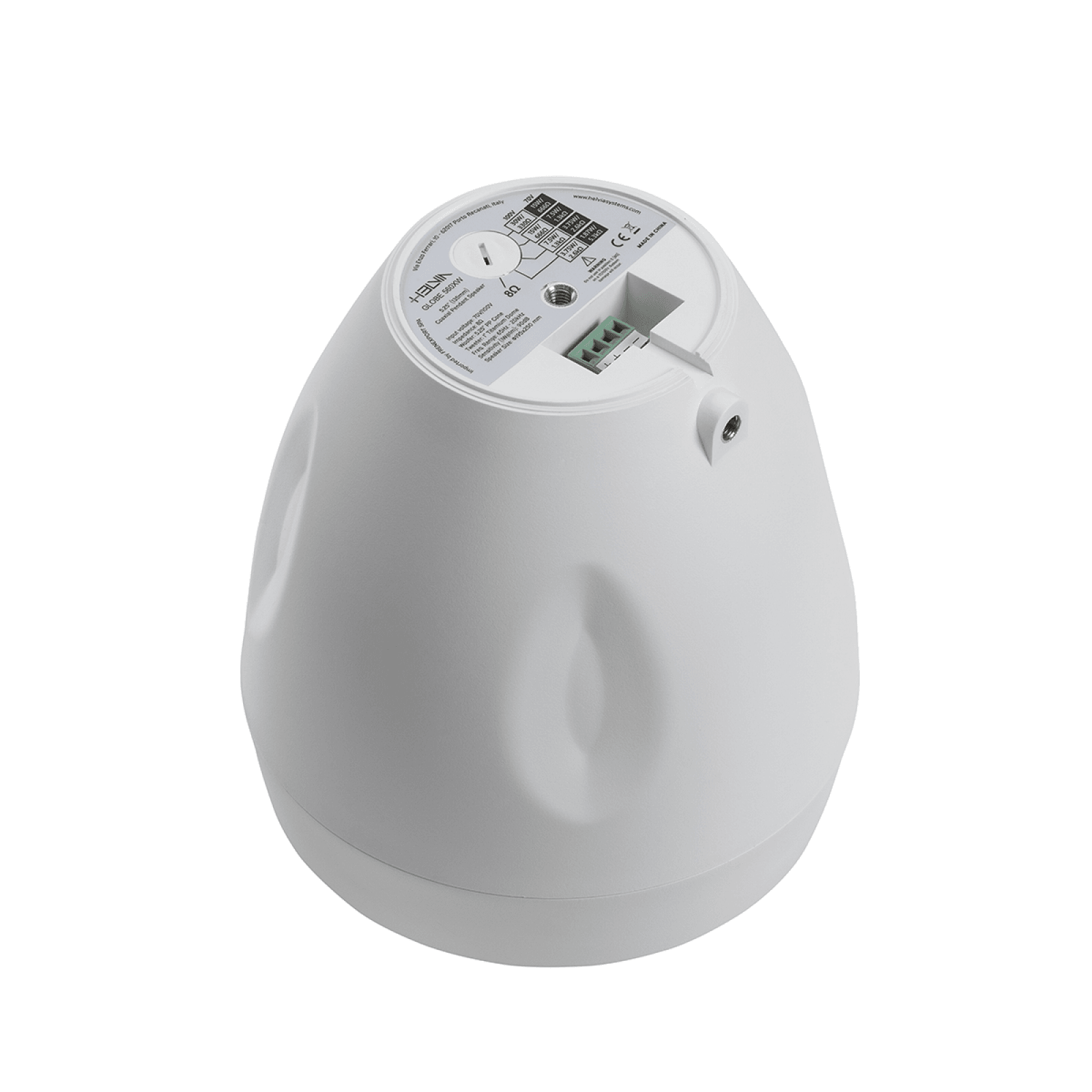 Il look è elegante, discreto e il materiale in ABS è di alta qualità. Nella parte posteriore, oltre alle connessioni Phoenix e il selettore di potenza, va avvitata la vite a occhiello alla quale agganciare uno o più cavi di appendimento (un cavo di sicurezza in acciaio con sezione D3,mm e 1m di lunghezza è in dotazione).