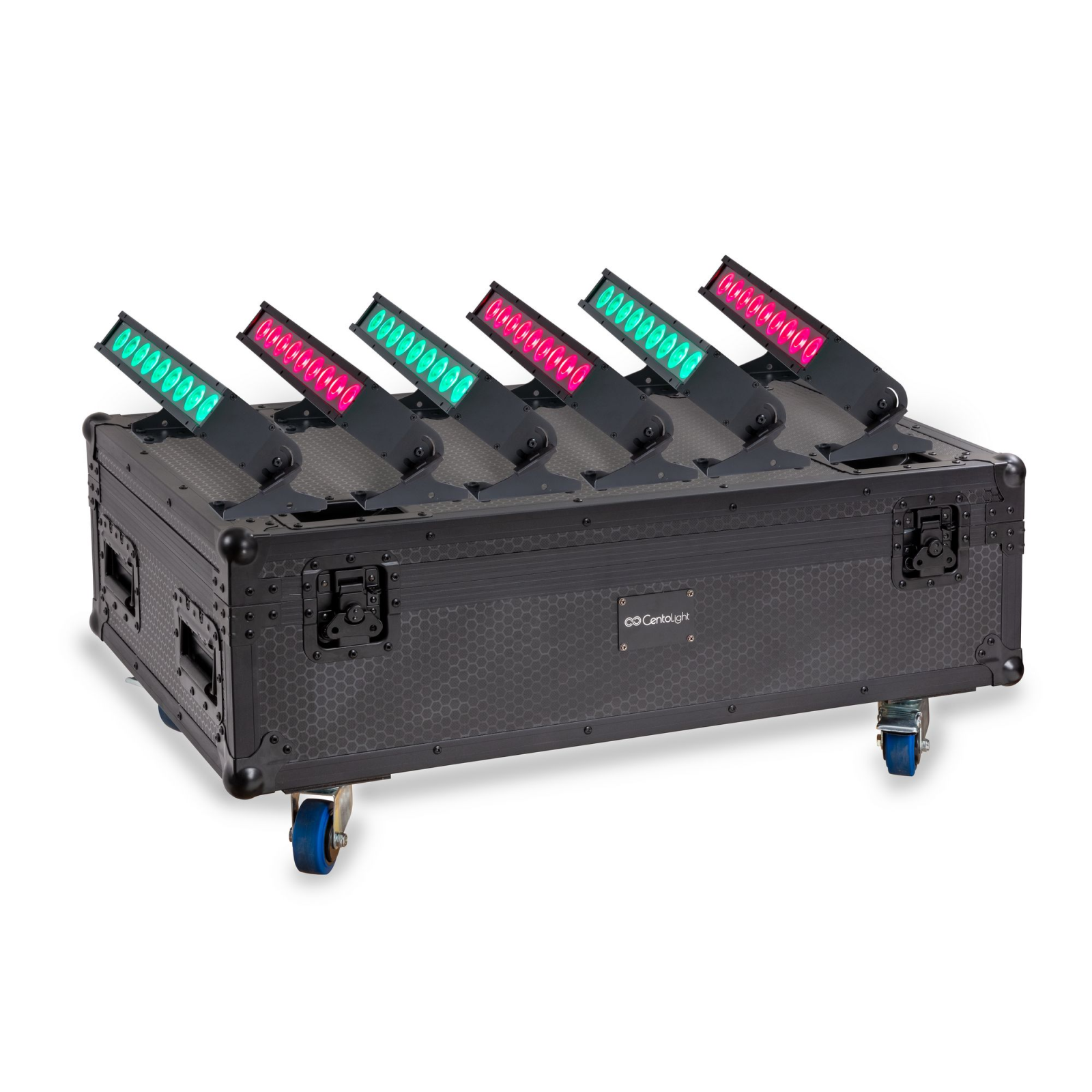 Il sistema viene fornito come set completo di sei proiettori alloggiati in un pratico flight case con funzione di ricarica. Basta inserire i proiettori nel case, collegarli tramite i connettori interni e connettere l’ingresso di alimentazione esterno alla rete elettrica per una ricarica rapida e semplice.