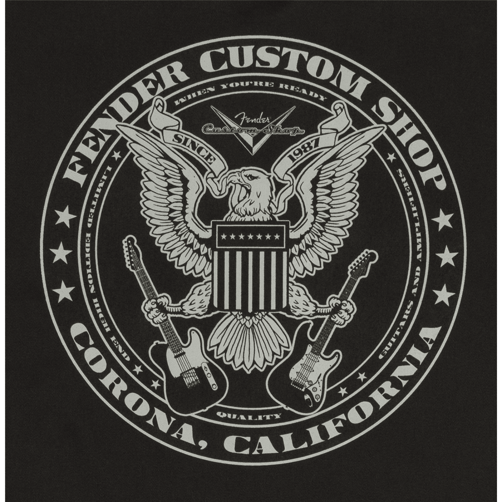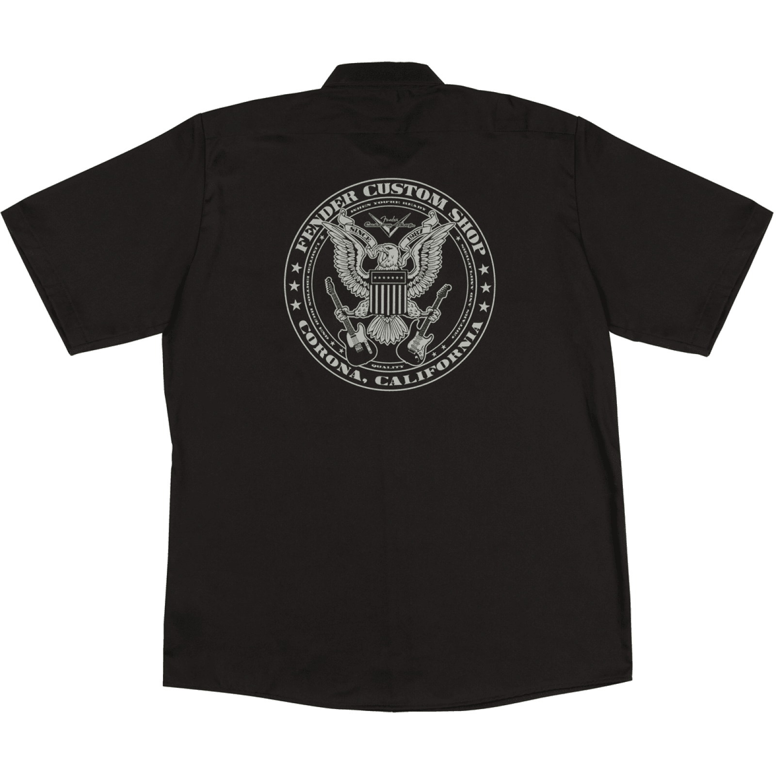 Celebra la Dream Factory, il Fender Custom Shop, con questa maglietta da lavoro con il classico logo chevron sul petto a sinistra e il logo dell'aquila sul retro.
