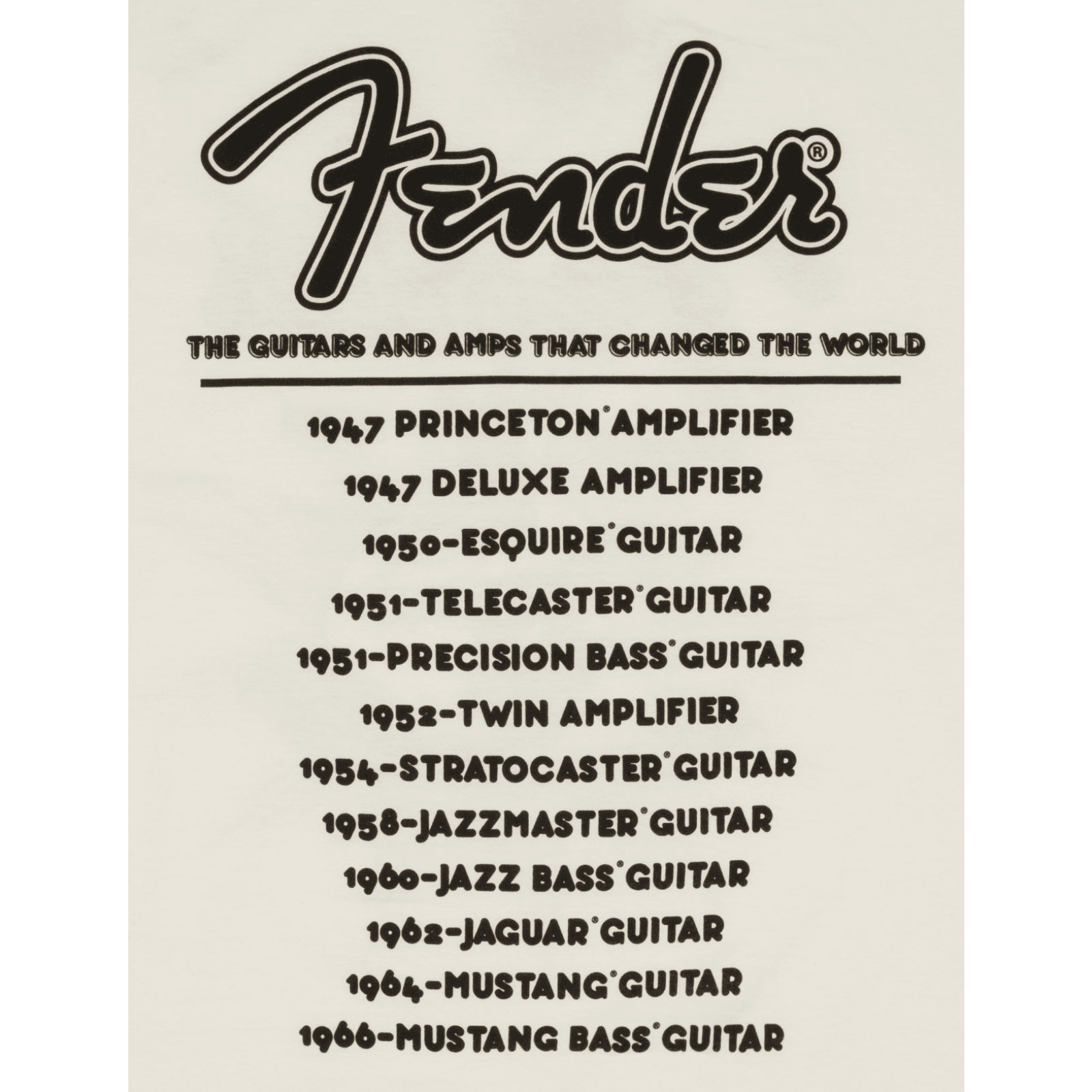 Il tour mondiale di Fender's® sta per iniziare con questa t-shirt del tour del passato. In bianco vintage, con le iconiche date di rilascio di Fender® sul retro, ti sentirai parte della nostra ricca eredità. A partire dal 1947 con la data di uscita del nostro famoso amplificatore in tweed classico Princeton® e terminando il tour nel 1966 con la data di uscita del nostro celebre basso Mustang® del 1964. Che viaggio è stato!